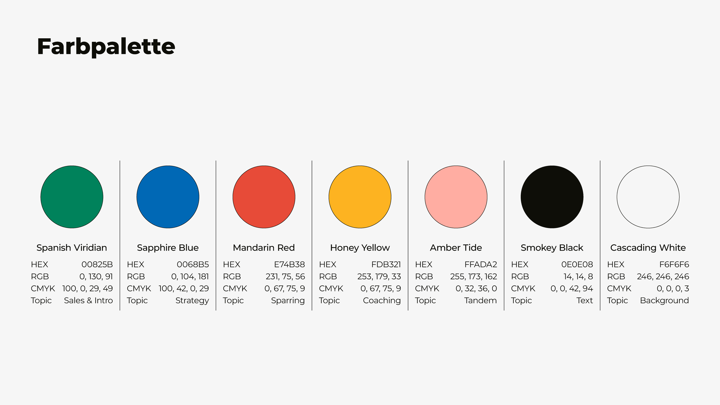 Bauhaus-Palette. Jede Farbe codiert einen Arbeitsbereich: Mandarin für Sparring, Viridian für Sales, Honiggelb für Coaching. Das System erklärt sich von selbst – auch Timos Kunden verstehen sofort, worum es geht.